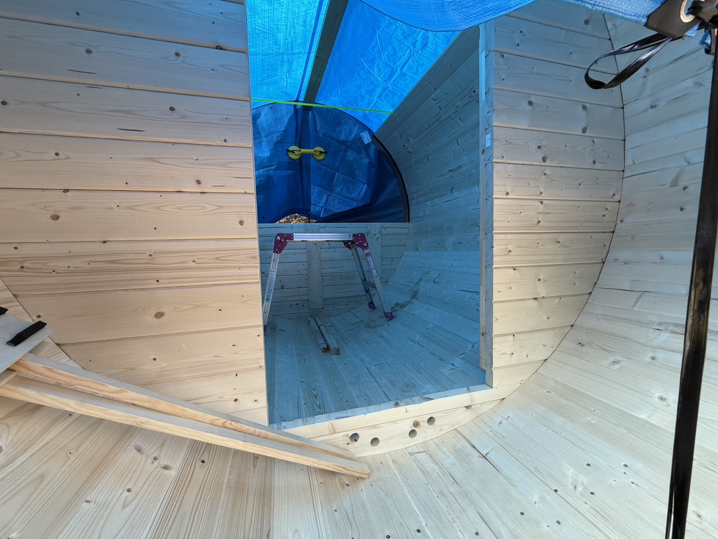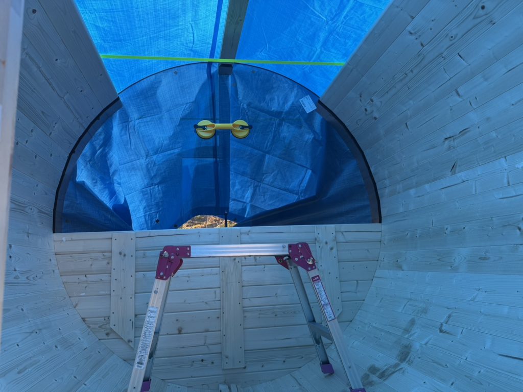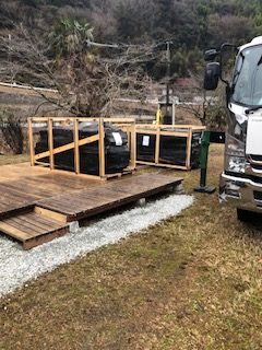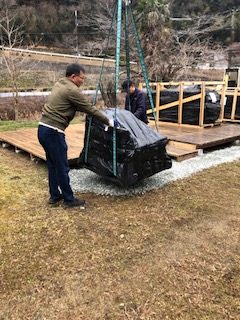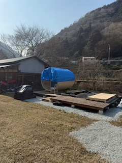 2月に高松市塩江町で円筒型バレルサウナ小屋 ヘルシンキとバレル型(樽型)ガーデンハウス ケミの搬入、施工開始いたしました。