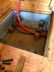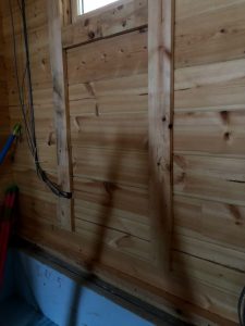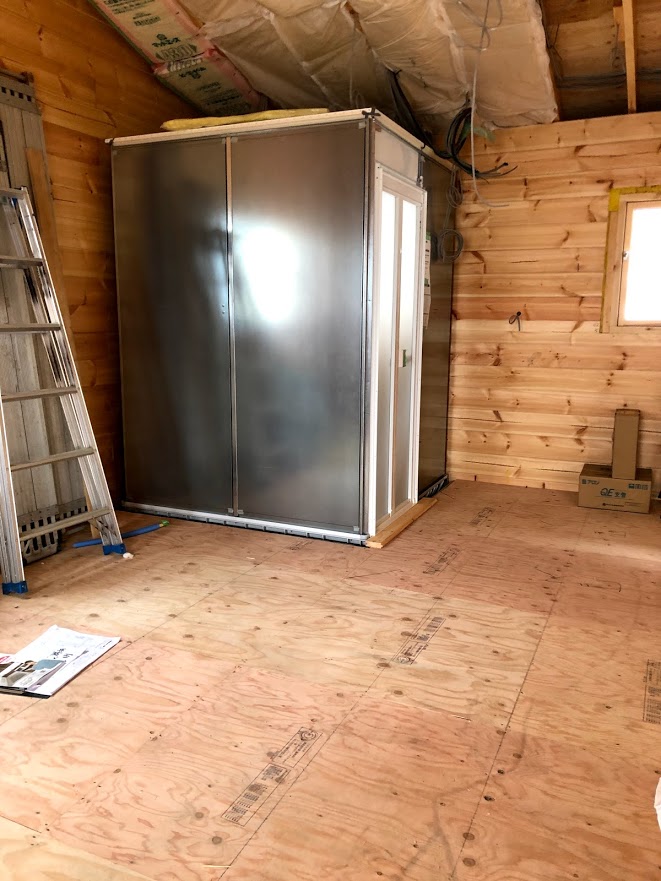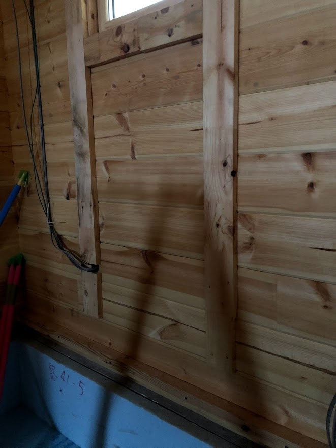 ログハウスはセトリング(木の縮み)が必ずあるので、ユニットバスの窓枠がだんだん下がらないように、