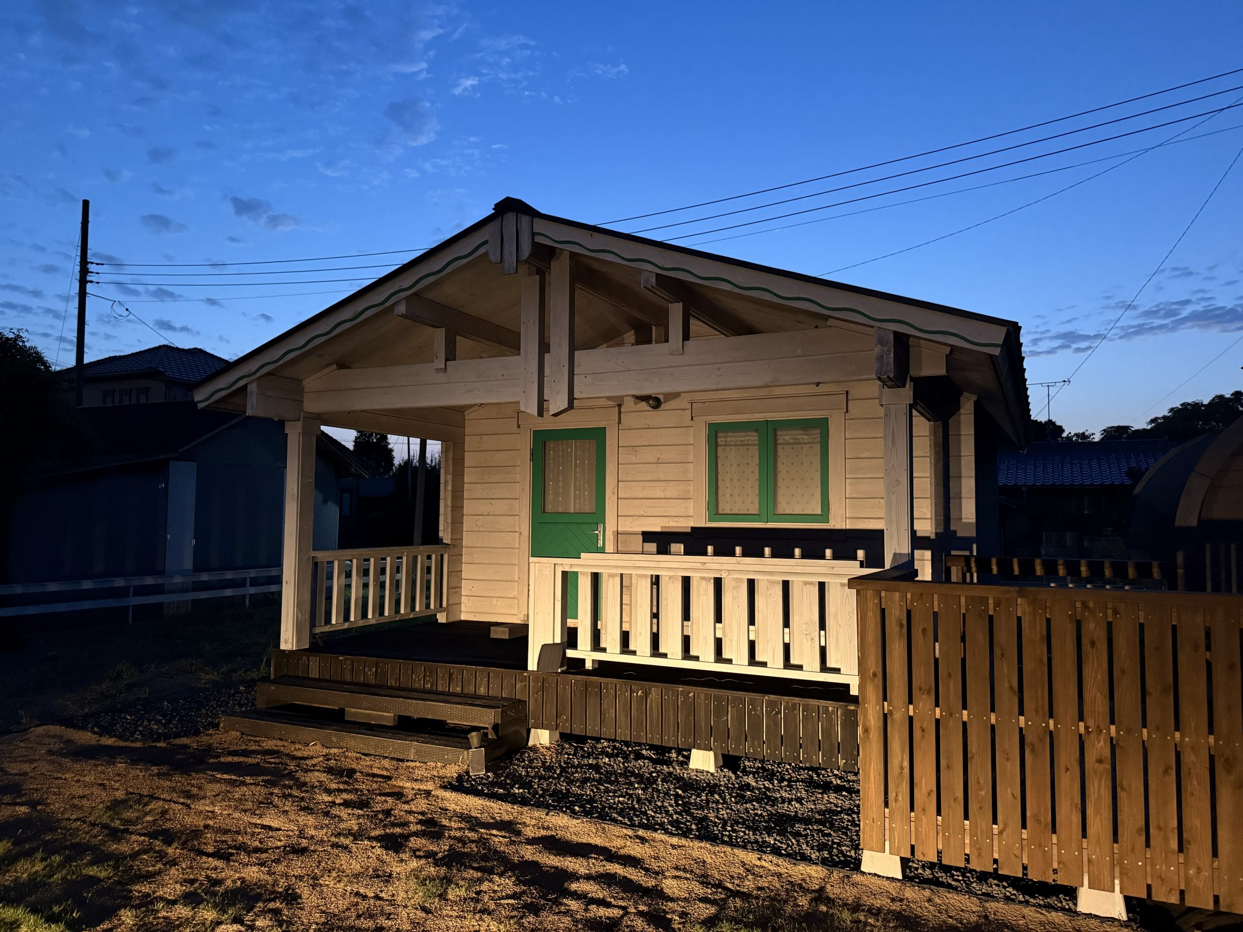 千葉県九十九里町にあるミニログハウス「ティッカ」の夜の雰囲気をお届けします(^_^)👍
