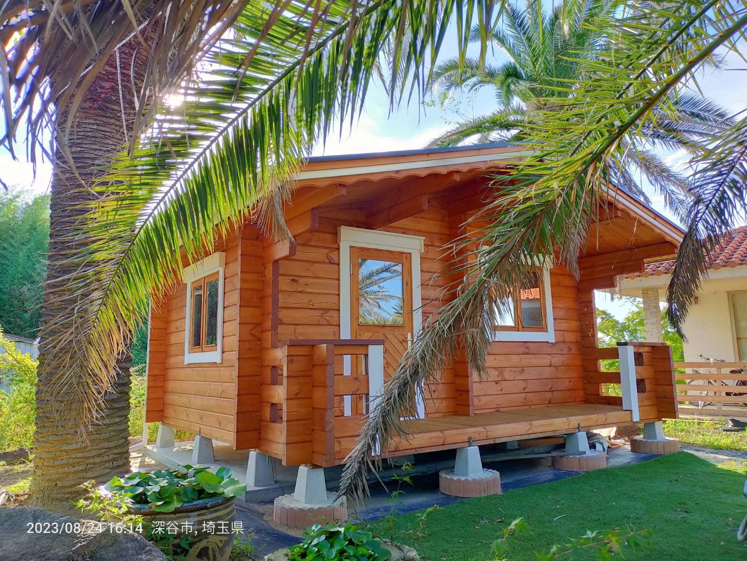 ヤシの木の間に建つメリのパインカラーとカバーボードの白、空の青が映えています。