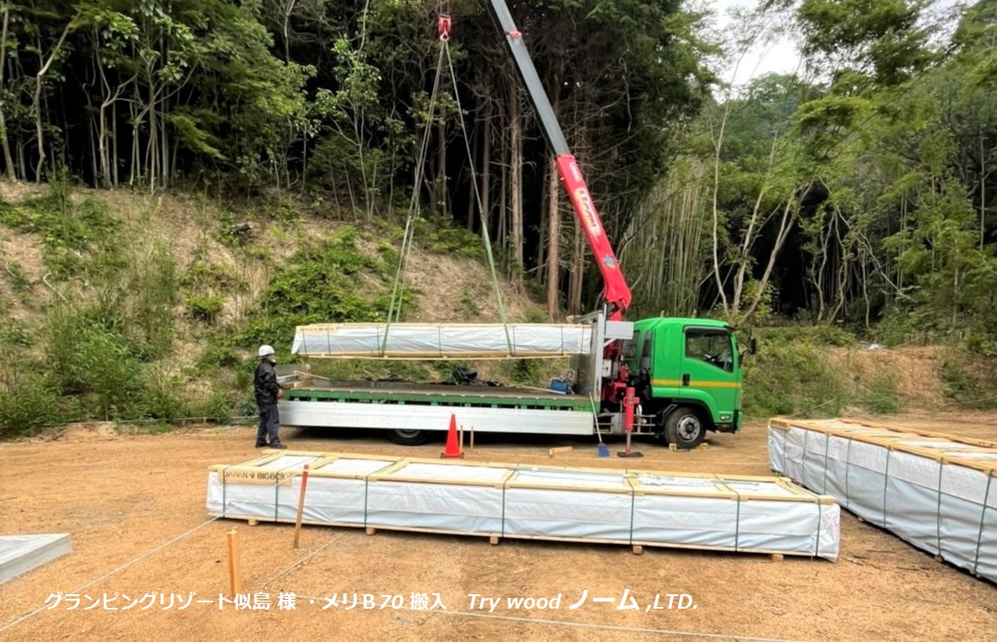 グランピングリゾート似島・ログハウス「メリB70」到着!