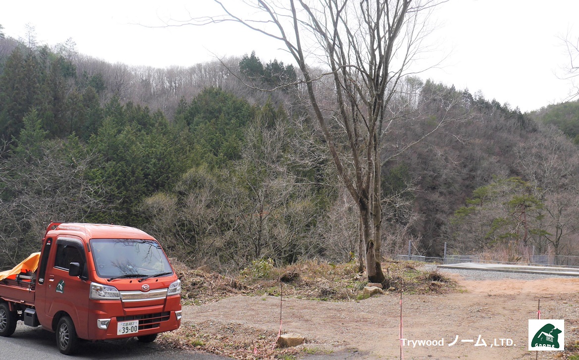 “ Yさん ” のアウトドアBASE用のミニログハウス「ロマーニ50」の設置現場を下見訪問しました。