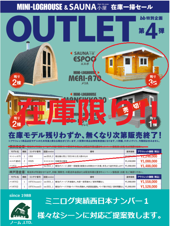 売り切れゴメン! 在庫限りの ミニログハウス OUTLET の ご案内です。