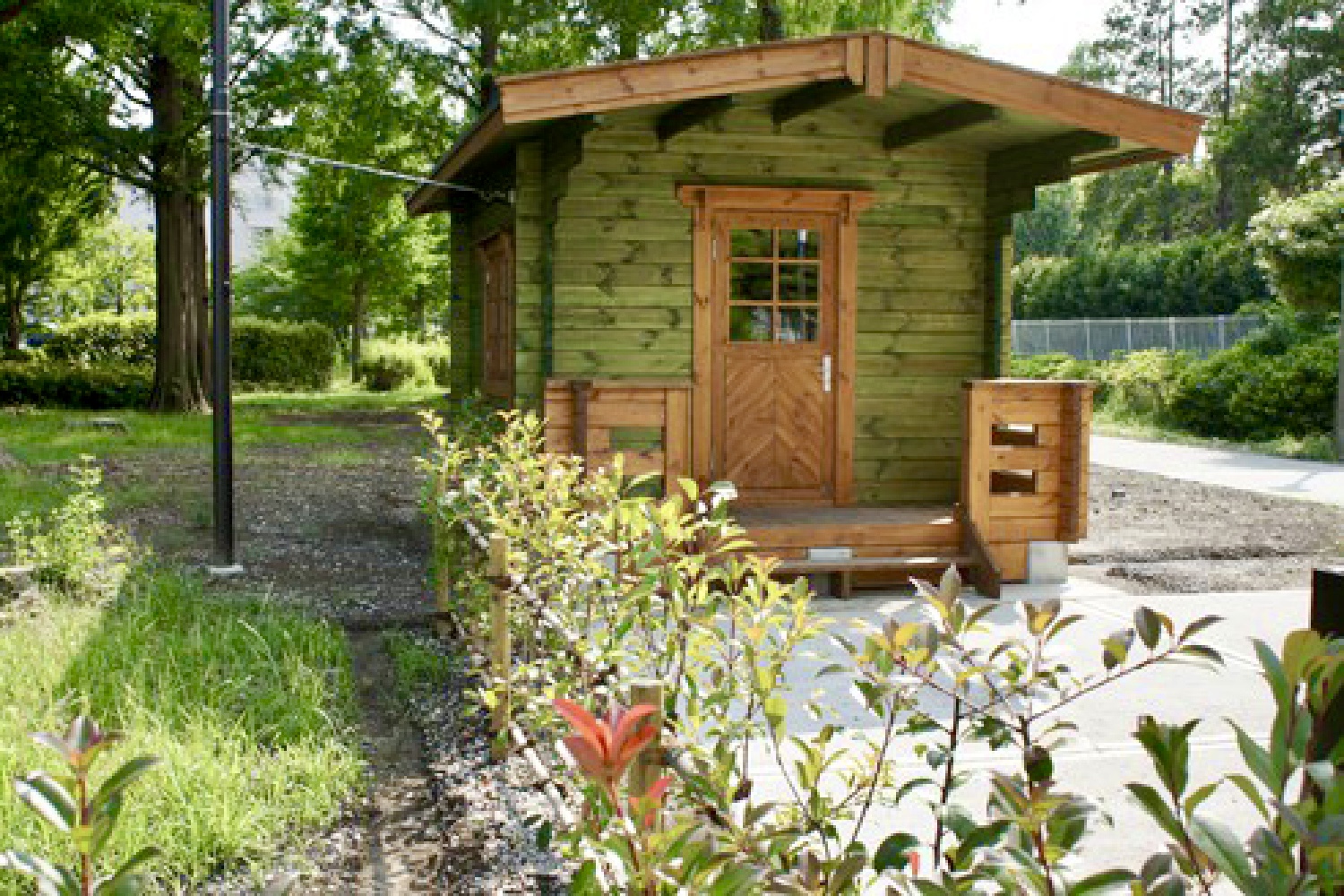 団地内の市民農場にぽつりと建ち、外壁は周りの景観に合わせグリーンの浸透系塗料で木目が浮かび上がり、自然感漂う塗装となっています。