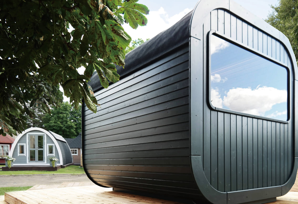 滑らかな曲線・大きな窓が特徴的で使い勝手も良く、かつモダンでおしゃれなサウナ小屋です。