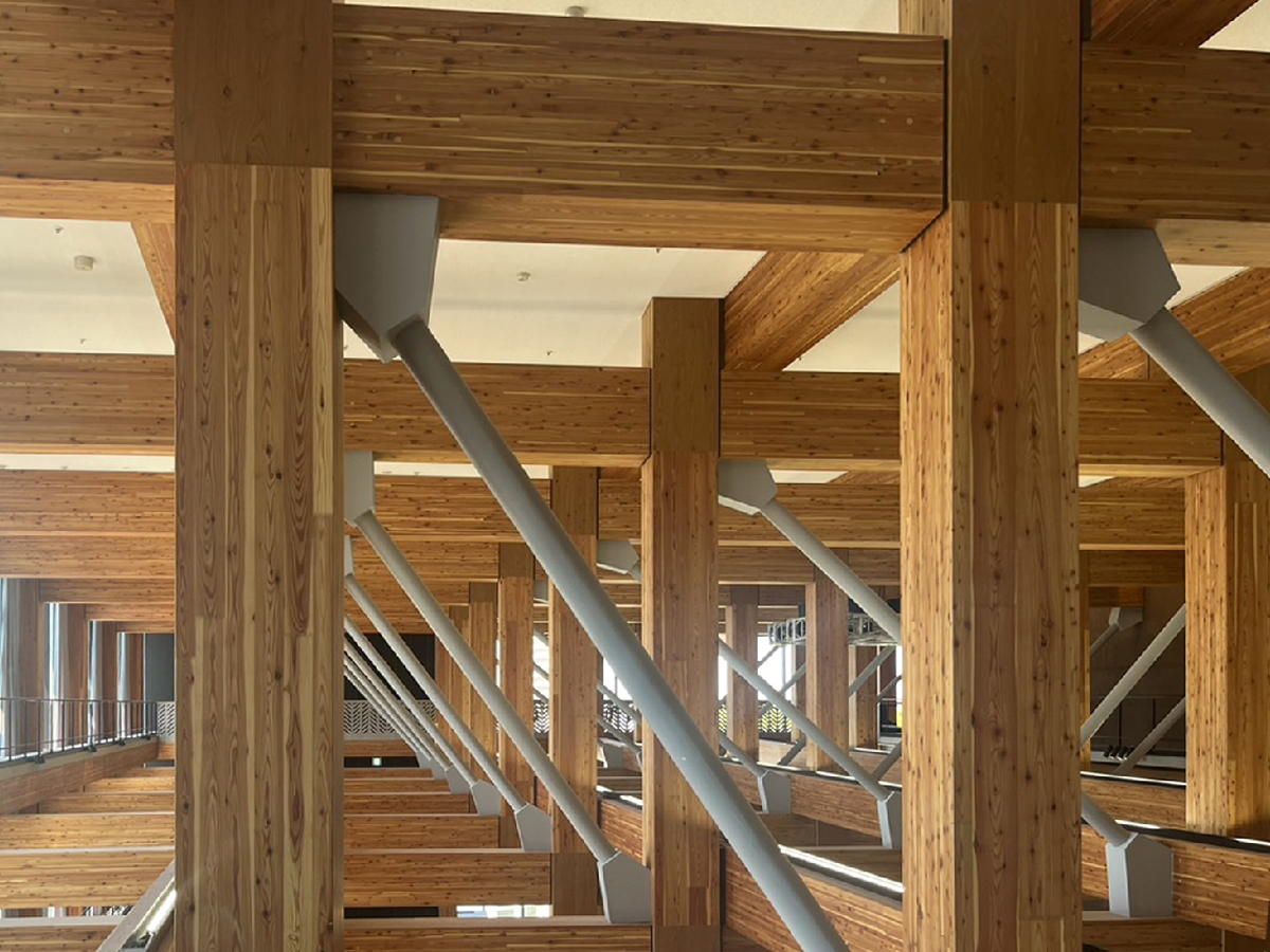 また、使っている木材は1時間の耐火認定を取得した耐火木集成材「燃エンウッド」で、国内公共施設における耐火建築物としては最大級だそうです。