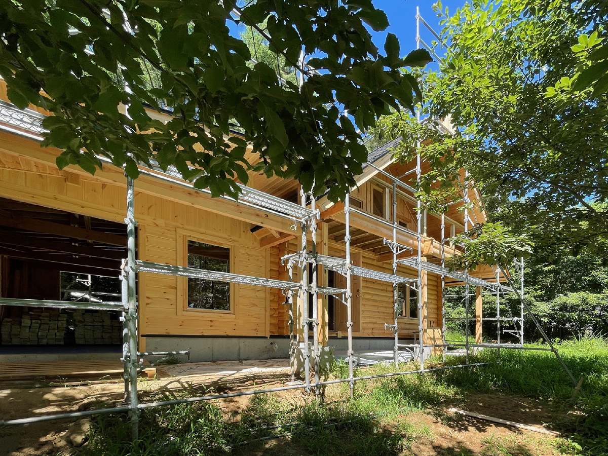 緑豊かな小淵沢の森の中に、ひっそりとログハウスが建築中。