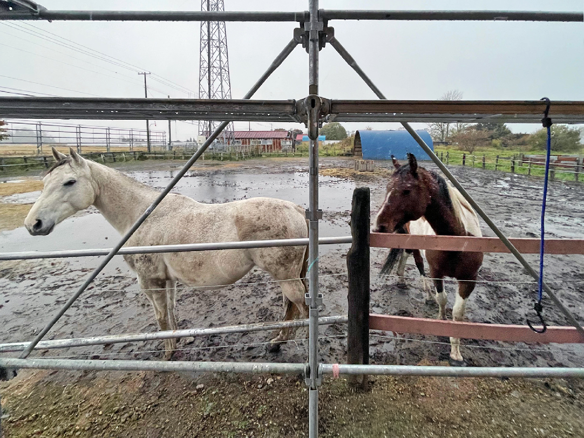 足場の間から白馬がじーっと現場をチェックして、隣の馬も「銀吉、ちゃんと進めてるか?」と言ってるような雰囲気。