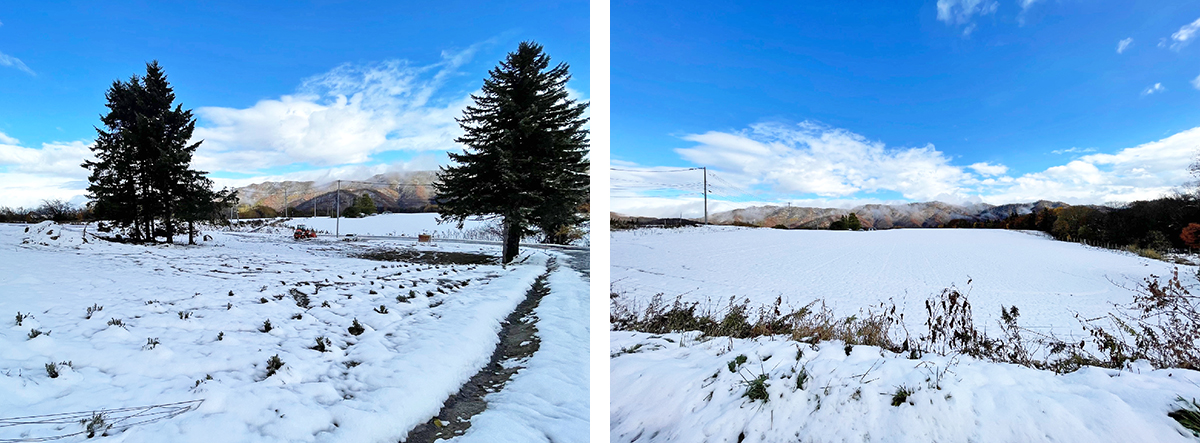 畑の奥には青空と山並みの絶景が広がっていて、ここに来年ログハウスカフェが建つと思うとワクワクが止まりませんっす!