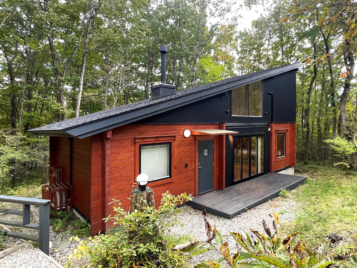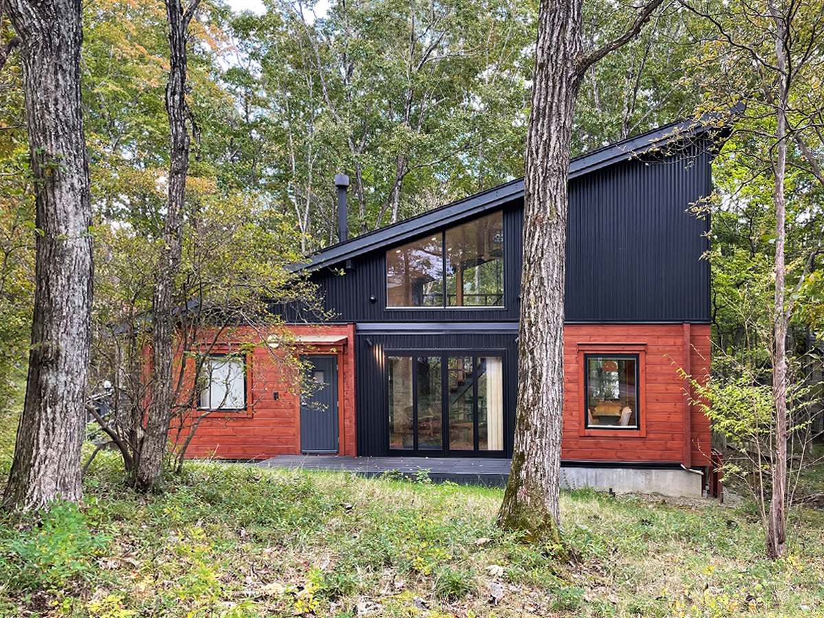 片流れ屋根のラインが那須の木立と馴染んで、紅葉の季節は黒い外壁が一段と映えます。