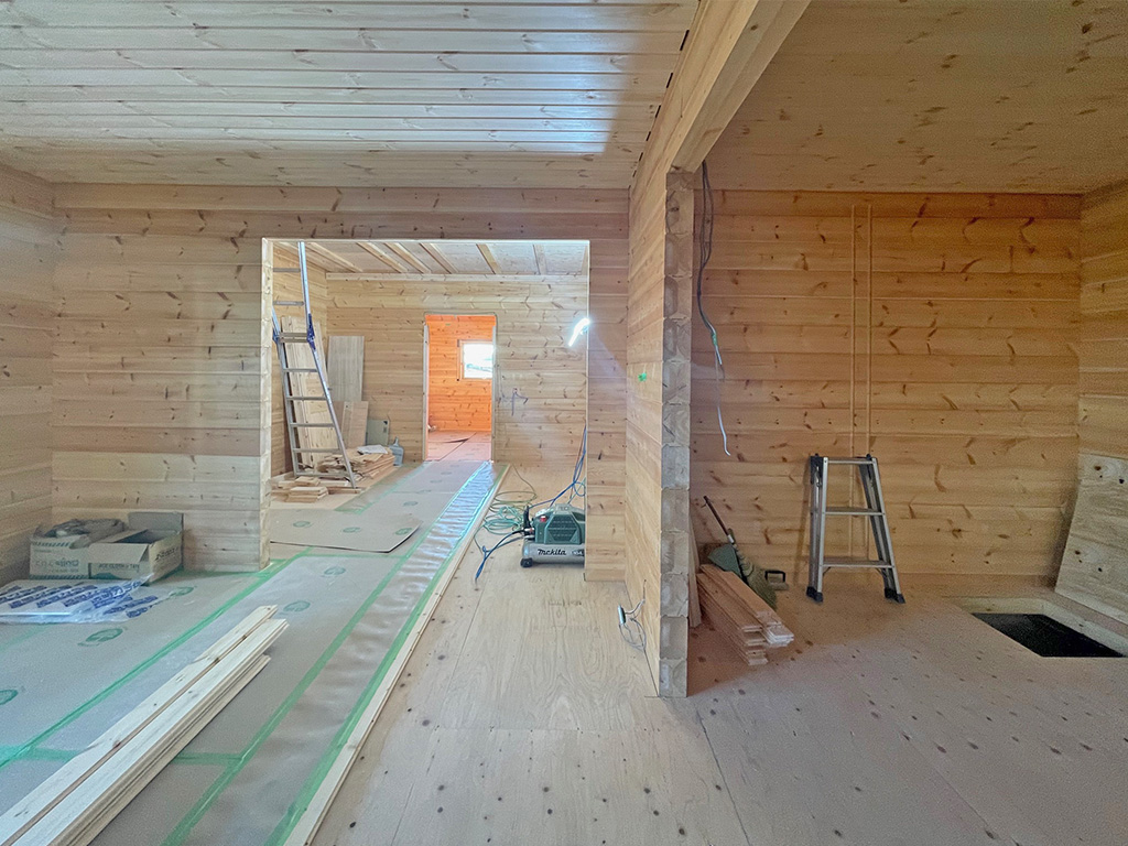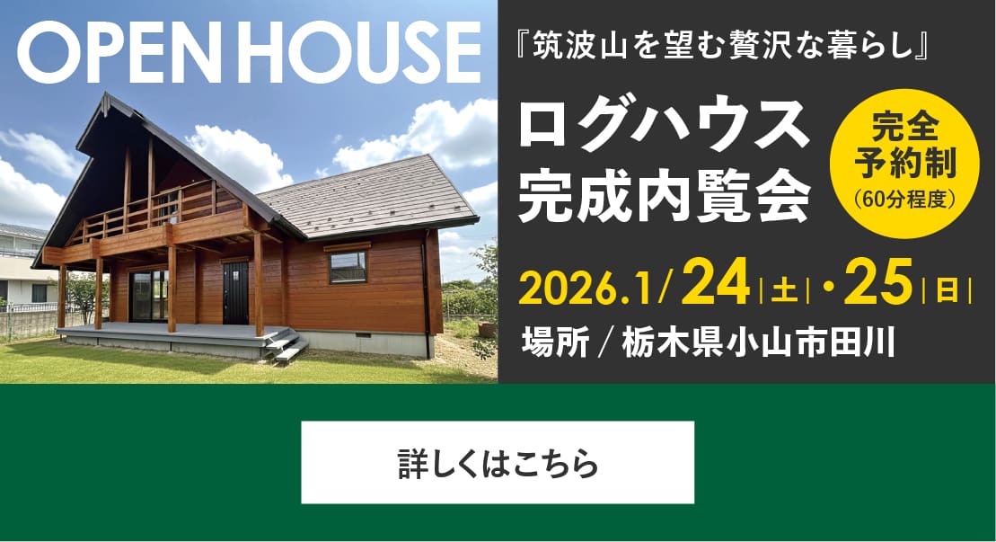 今回の住まいは、ログハウスの定番ともいえる大屋根モデルを採用し、伸びやかな屋根形状が外観に安心感と重厚感を与えています。