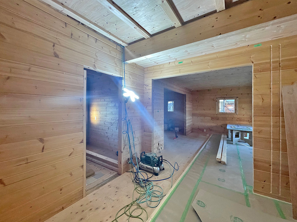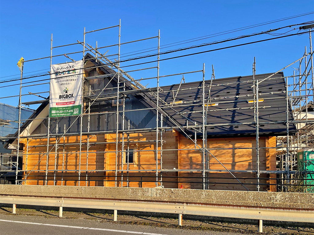 外壁は人気の赤茶色のログ壁に黒を基調とした屋根・建具を組み合わせ、落ち着きがありながらも引き締まった印象の外観に仕上がる予定です。