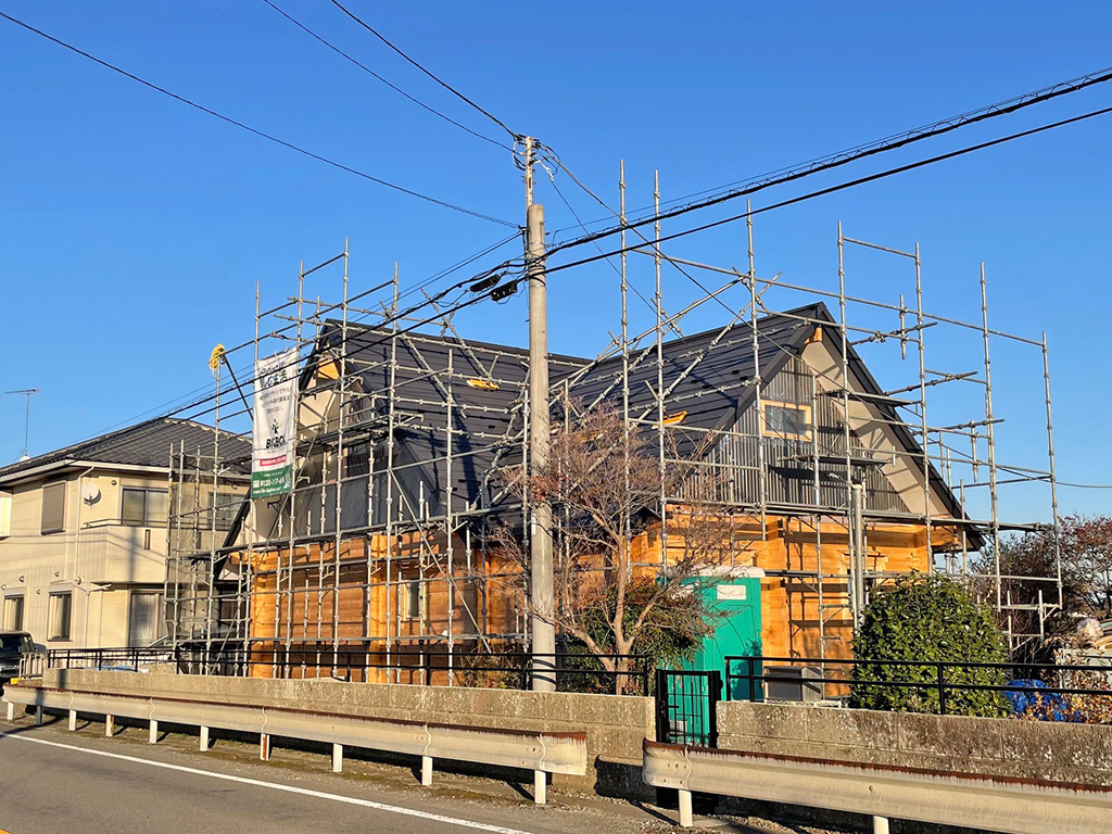 交通量のある県道沿いに建つ農家の分家住宅として計画され、来年の完成に向けて現場が進んでいるっす。